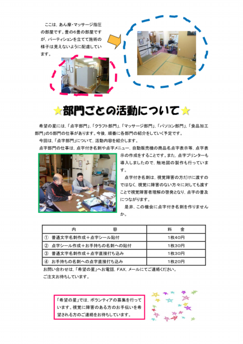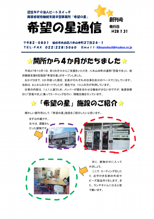 平成27年10月1日,多くの方々からご支援をいただき,八木山本町の通称「恐竜やま」に,就労継続支援B型施設「希望の星」がオープンしました。